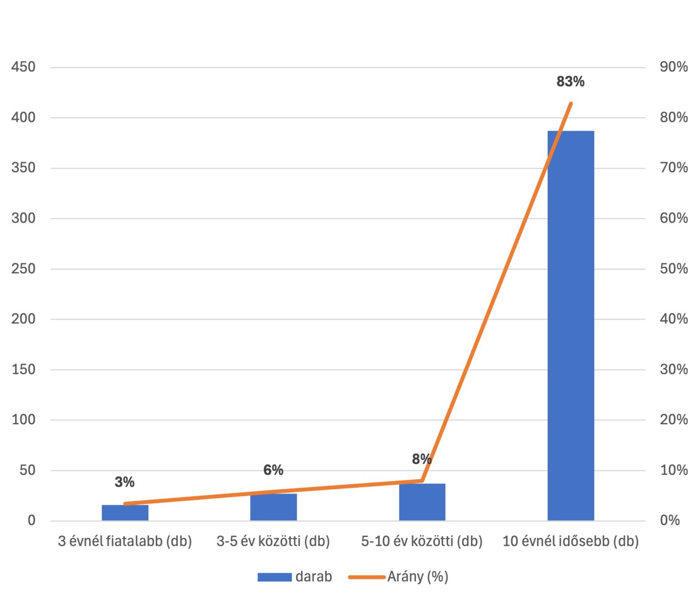 A 3 évnél fiatalabb vállalatok mindössze 3%-ot tesznek ki, a 3–5 évesek 6%-ot, míg az 5–10 év közötti cégek aránya is csupán 8%. Ez alapján látható, hogy a friss szereplők nehezebben kapaszkodnak meg, miközben a régebb óta működők stabilan tartják a pozícióikat.