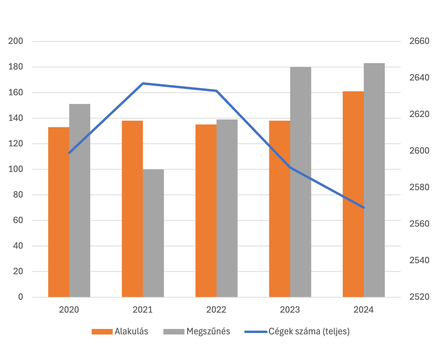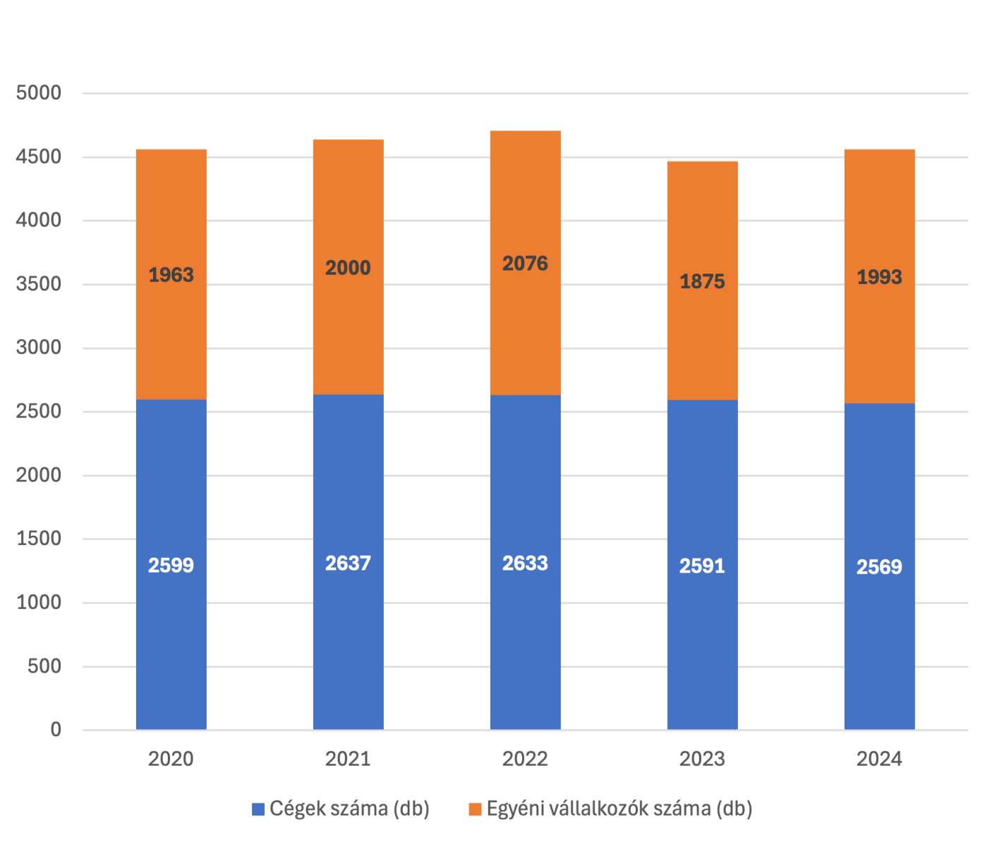 Az egyéni vállalkozások továbbra is erős lábat jelentenek a piac szerkezetében: a társas és egyéni vállalkozások együttes számának közel 44 százalékát teszik ki. Bár a számuk 2022 óta hullámzik, 2024-ben ismét 1993 egyéni vállalkozót tartott nyilván a statisztika, közülük 78 százalék aktív. Ez a rugalmasság ugyan életképességet jelez, de egyben sérülékenységet is: ezek a szereplők a gyors reagálás mellett nagyobb kockázatot hordoznak a megszűnések tekintetében.