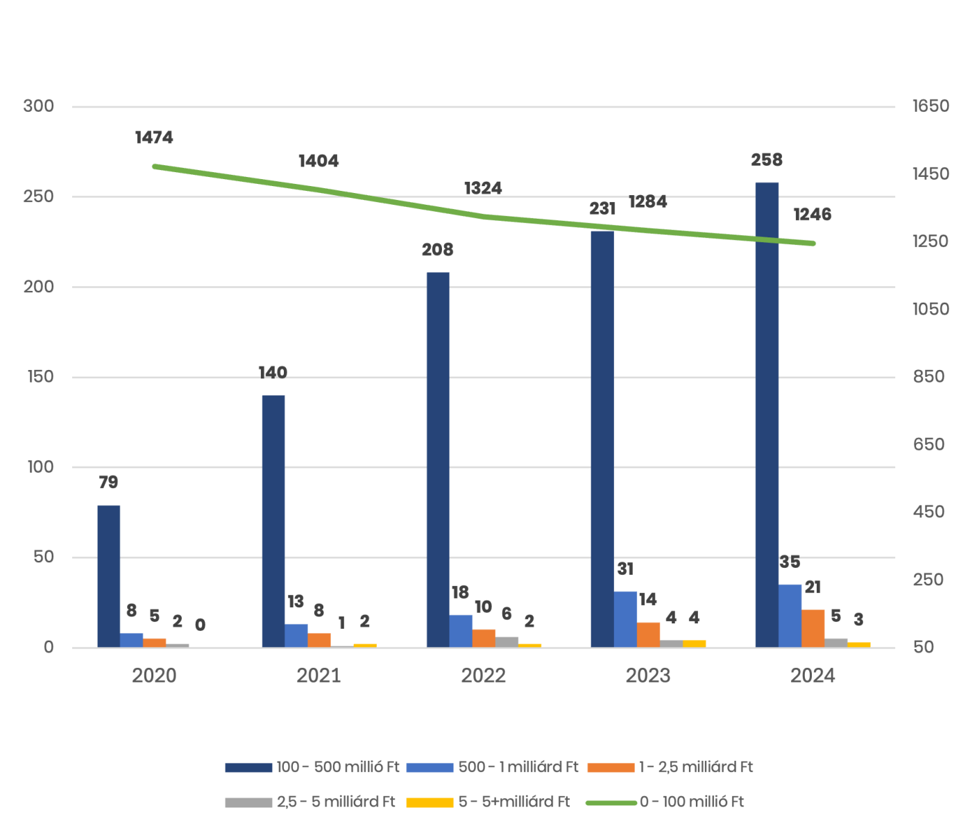 A növekedés mögött azonban erős koncentráció áll: a piac 80%-át mindössze a cégek 7,9%-a – 140 vállalkozás – termelte meg. Az árbevétel-kategóriák bontása is ezt erősíti: a kisebb, 100 millió forint alatti kör továbbra is a vállalatok többségét adja (1246 cég), de a középmezőny fokozatosan erősödik. A 100–500 milliós sávban 258 cég található, míg az 500 millió és 1 milliárd közötti bevétellel 35 vállalkozás zárta az évet. A valódi húzóerőt azonban a milliárdos kategóriák adják: a 1–2,5 milliárd közötti sávban 21, a 2,5–5 milliárdos körben 5, míg az 5 milliárd fölötti ligában 3 cég működik.