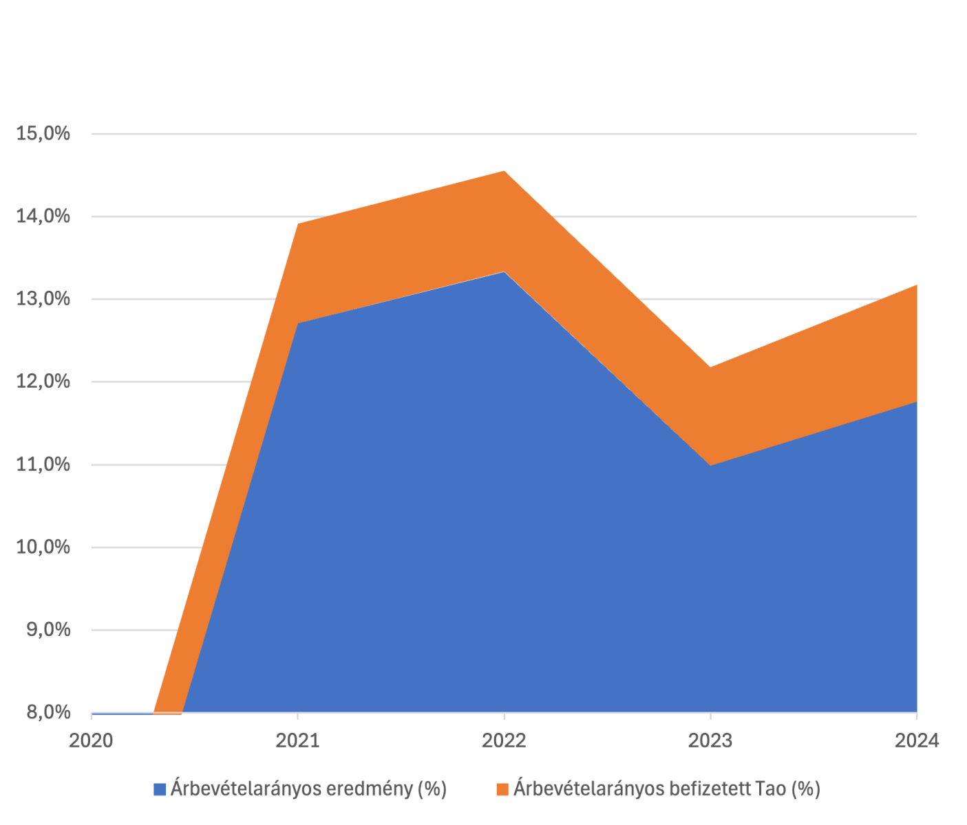 Ezzel párhuzamosan az állam felé teljesített közteher is dinamikusan bővült: míg 2020-ban még csak 595 millió forintnyi adót fizettek be a cégek, 2024-re ez az összeg meghaladta a 3,7 milliárdot. Az árbevételhez viszonyítva ez 1,41%-os arányt jelent – vagyis nemcsak a nyereség nőtt, hanem a költségvetés részesedése is.