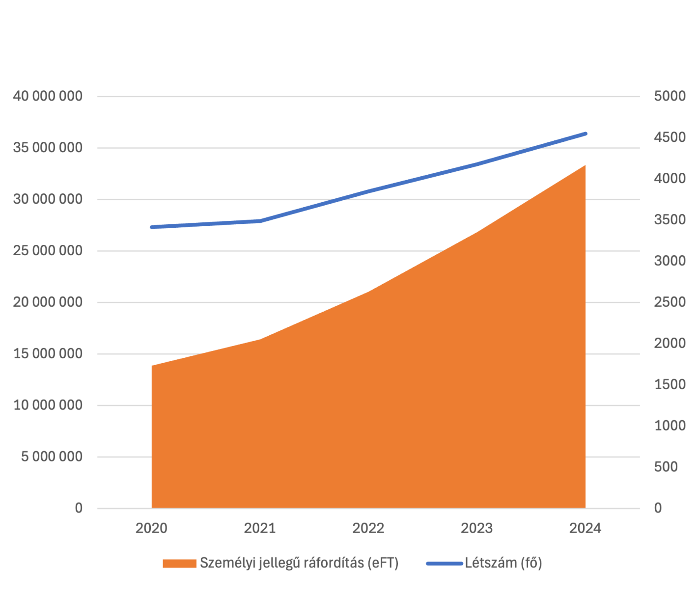 A személyi jellegű ráfordítások ezzel párhuzamosan dinamikusan emelkedtek: 2024-ben meghaladták a 33 milliárd forintot, ami 24,4%-kal több, mint egy évvel korábban. Ha a 2020-as szinthez viszonyítunk, akkor a bérköltségek több mint kétszeresére nőttek, ami jól jelzi a munkaerő árának folyamatos felértékelődését.
